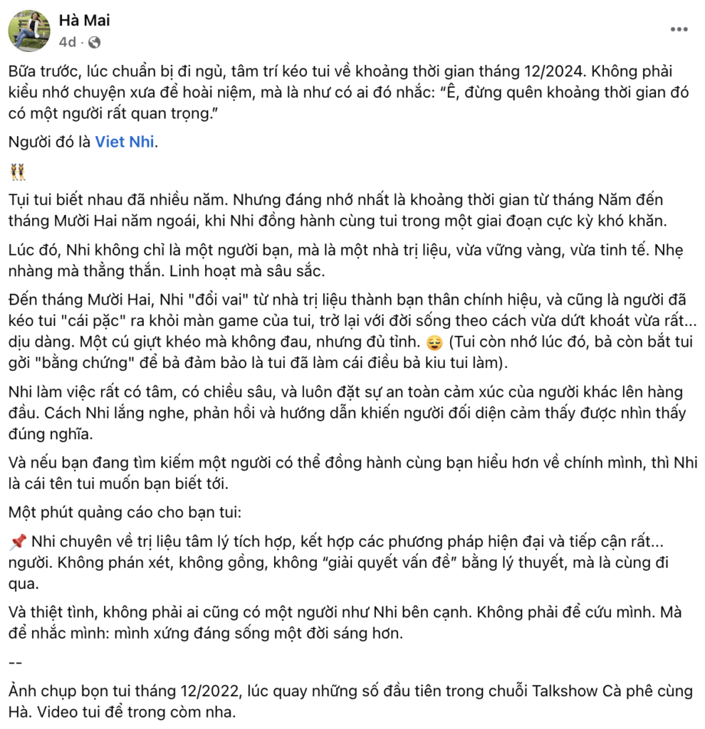 “Từ khi làm việc với chị Nhi em có lòng tin hơn hẳn đối với các dịch vụ tư vấn về chuyên môn khác, vì em thấy rất hiệu quả. Em thấy tinh thần thoải mái hơn, đặc biệt là trong những việc trước đây khiến cho em dễ bực bội. Em cũng hiểu mình hơn rất nhiều, các suy nghĩ cũng rõ ràng hơn, không còn hoang mang suy nghĩ lung tung nữa.